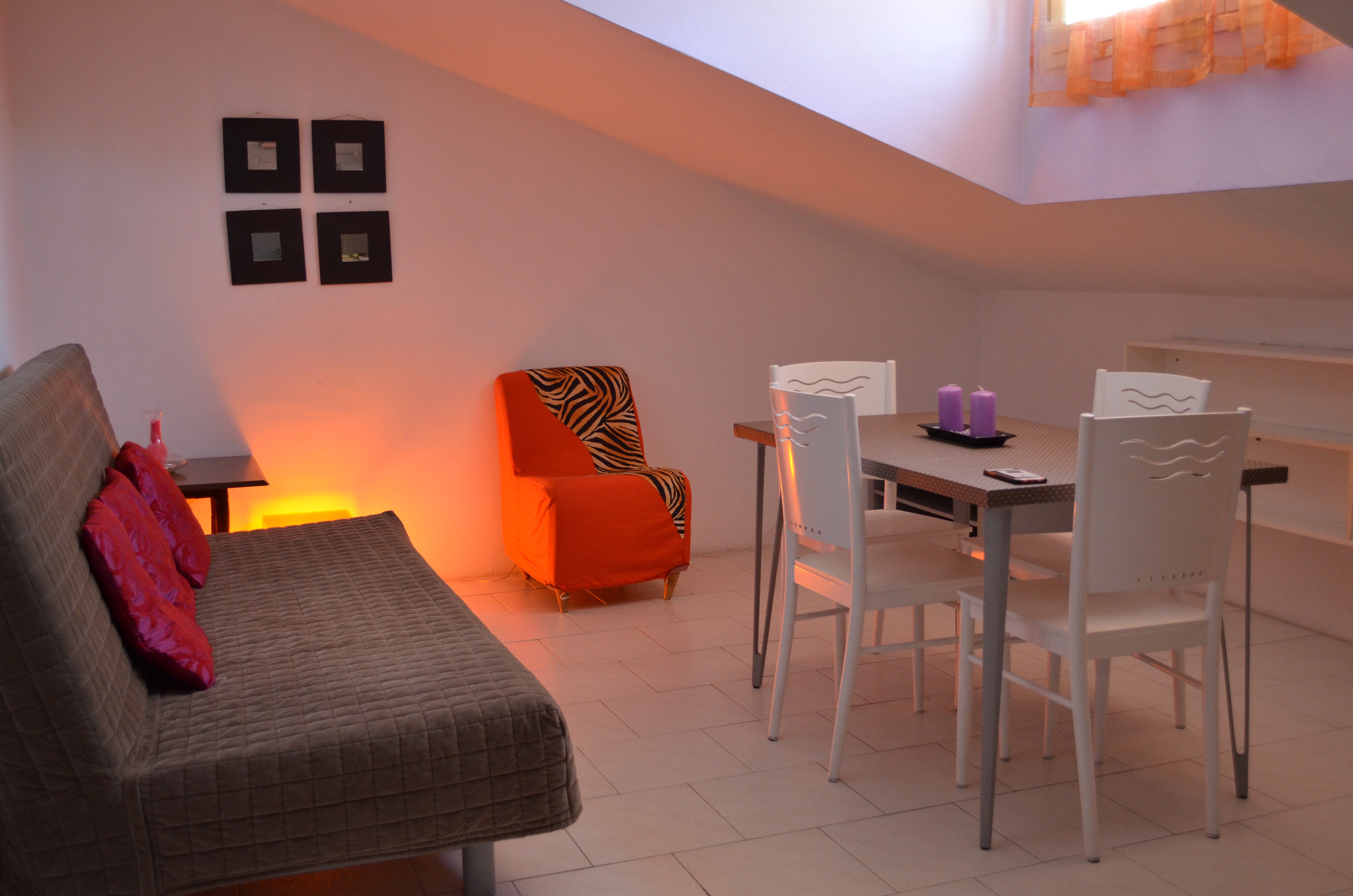 Ingresso, cucina con balcone, soggiorno con dicano letto matrimoniale con ampio terrazzo con tavolo e sedie.
